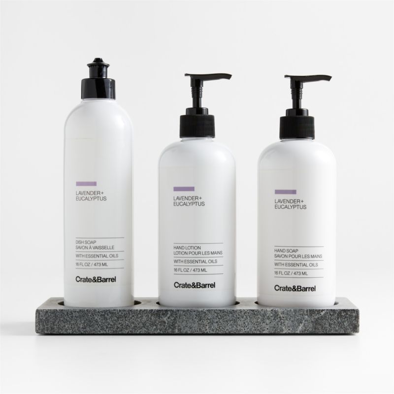 Wash dishes and clean and soothe hands with the herbal fragrances of lavender and eucalyptus featured in this exclusive four-piece set. Our dish soap tackles grease and residue with ease. Once the dishes are done, our hand soap moisturizes with sunflower seed oil and aloe vera as it cleans, while the hand lotion boasts mango seed oil and aloe. All three are made with plant-based formulas scented with essential oils that leave behind a fresh, clean aroma of geranium, lavender, vetiver and eucalyptus against a backdrop of zesty citrus. Cut, finished and polished by hand, the black marble caddy keeps the bottles right at hand while looking neat and stylish.