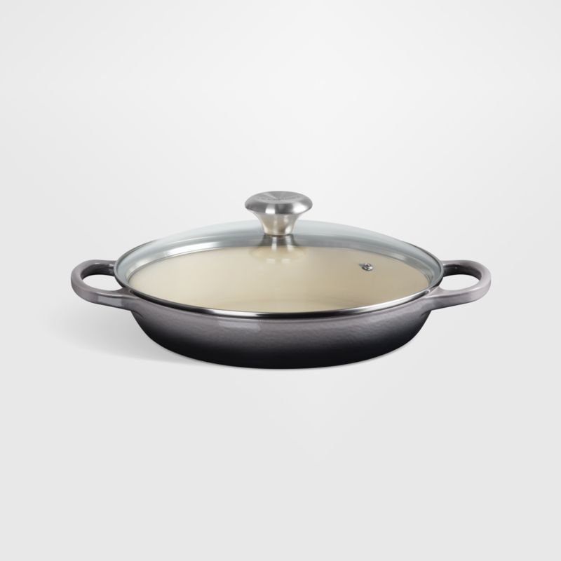 Clad in ombre grey enamel inspired by oysters, this cast iron braiser is impervious to acid, odors and stains—and requires no seasoning. The tight-fitting glass lid creates a blanket of heat for even cooking, ideal for braising meats or vegetables and keeping casseroles or baked goods warm (and keeping an eye on your recipe's progress). This versatile pan goes effortlessly from stove to oven to table for an elegant presentation of short ribs, oyster stuffing or apple crumble.