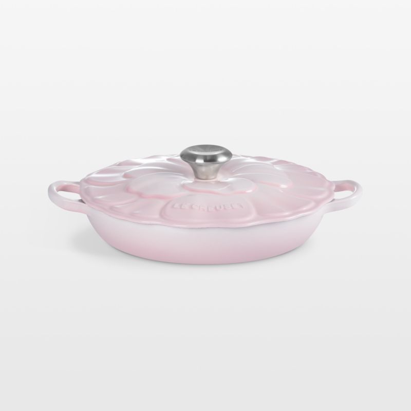Enameled in a delicate shade of pink inspired by seashells, Le Creuset's cast iron Petal braiser infuses your kitchen and your cooking with the vibrancy of spring blossoms and summer blooms. Layered and lavish embossed petals shape the lid, surrounding the stainless steel knob that serves as the flower's center. Cast iron retains and distributes heat optimally, while the durable enamel coating—blush on the exterior, sand-hued within—renders the shallow pan impervious to stains, chips and cracks. The close-fitting lid creates a blanket of heat for even cooking, making the versatile pan lends ideal for braising as well as browning, sauteing, baking and keeping food warm. Going from stove to oven to table for serving spring brunches, Easter dinner and festive meals any time of year, this braiser makes a stunning addition to a Le Creuset collection.
