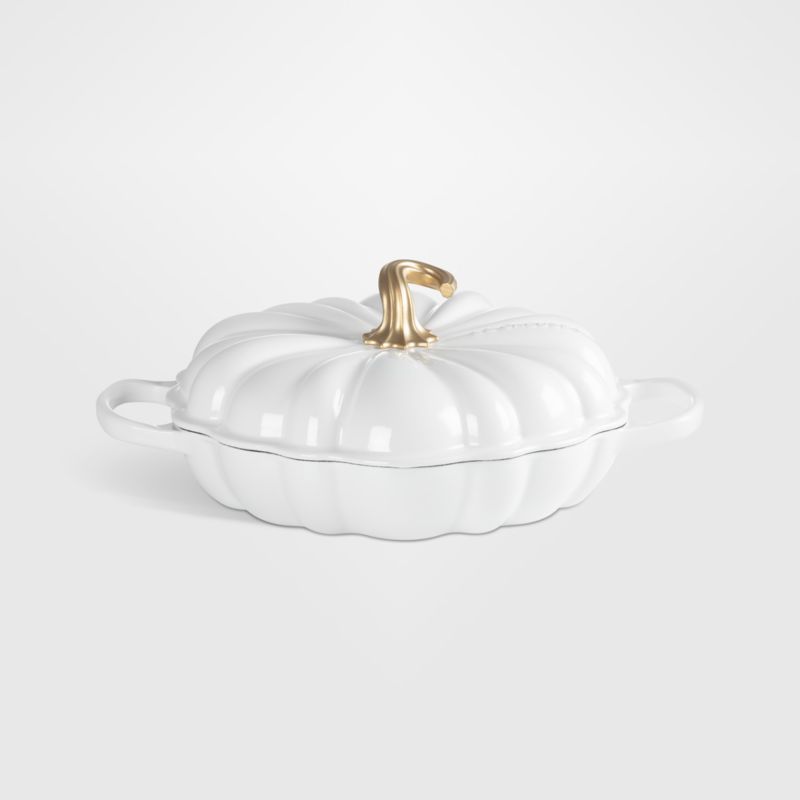 Inspired by fairy tale imagery, Le Creuset's pumpkin-shaped braiser is a delightful addition to your seasonal table. Crafted of cast iron glazed in heirloom-pumpkin white, the ribbed pot provides steady, even heat with a wide base designed for single-layer searing as well as braising and baking. Topped with a stainless steel handle sculpted to resemble a gourd stem, the white pumpkin braiser lends seasonal charm to your Thanksgiving table and also makes a great gift.