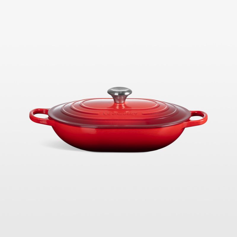 Porcelain enamel coats this display-worthy casserole dish in a deep ombre red inspired by cherries. The shallow oval shape accommodates fish, large cuts of meat or vegetables and roasts them to perfection. Or top the baking pan with the lid to bake deliciously moist casseroles. Cast iron offers impeccable heat distribution and retention, while the enameled surface minimizes sticking and staining. Designed with sloped sides for effortless serving, the covered casserole goes beautifully from stove to oven to table and cleans up easily in the dishwasher.