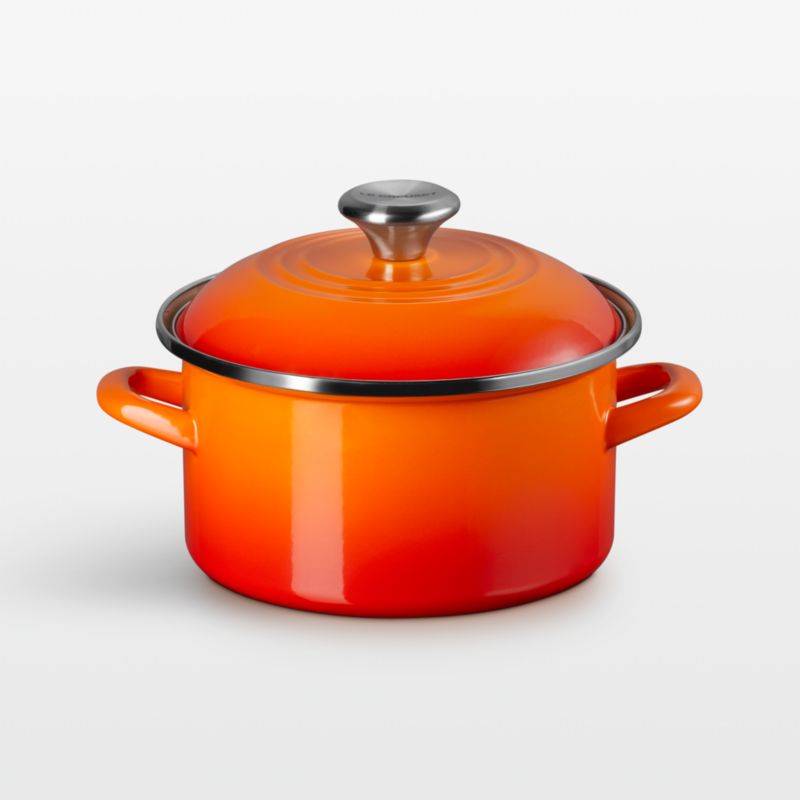 Le Creuset's trademark ombre red-orange finish in fiery shades of molten iron coats this petite stockpot. The stain-resistant finish glazes a base of lightweight, fast-heating and responsive carbon steel. Two stainless steel accents—a rim that prevents chipping and an ergonomic knob on the lid—add gleaming highlights. The small-yet-versatile stockpot is perfectly sized for simmering soups and sauces or cooking grains.
