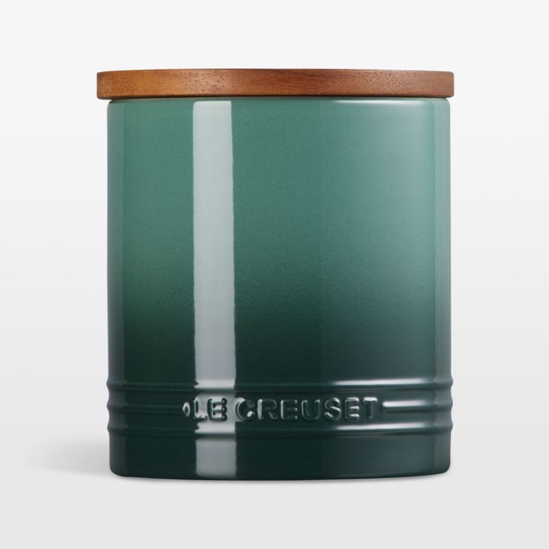 Glazed in a rich green inspired by artichokes, this canister graces a countertop or pantry with the same gorgeous color, classic design and well-crafted durability that made Le Creuset cookware famous. Made of premium stoneware, the clean-lined round container is clad in glossy non-porous enamel that blocks moisture absorption and resists cracking and crazing. A beautifully grained acacia wood lid has a silicone gasket for an airtight seal. Also available in two complementary sizes in your choice of Le Creuset's signature hues, the large canister is debossed along the base with the company name and iconic ringed detail.