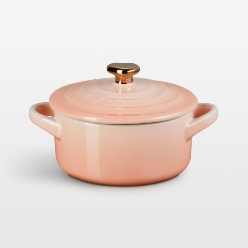 Perfect for an individual-sized souffle, peach cheesecake or chocolate lava cake, this mini cocotte makes a delightful presentation for Valentine's Day. The petite Dutch oven also bakes and serves pot pies or mac and cheese with love any day of the week. Inspired by perfectly ripe peaches and effervescent bellinis, the rosy Peche enamel that coats the durable porcelain glows with a hint of gloss. A heart-shaped knob finished in real gold provides a gleaming finishing touch to this darling baker—a covetable gift for your Valentine or favorite baker.