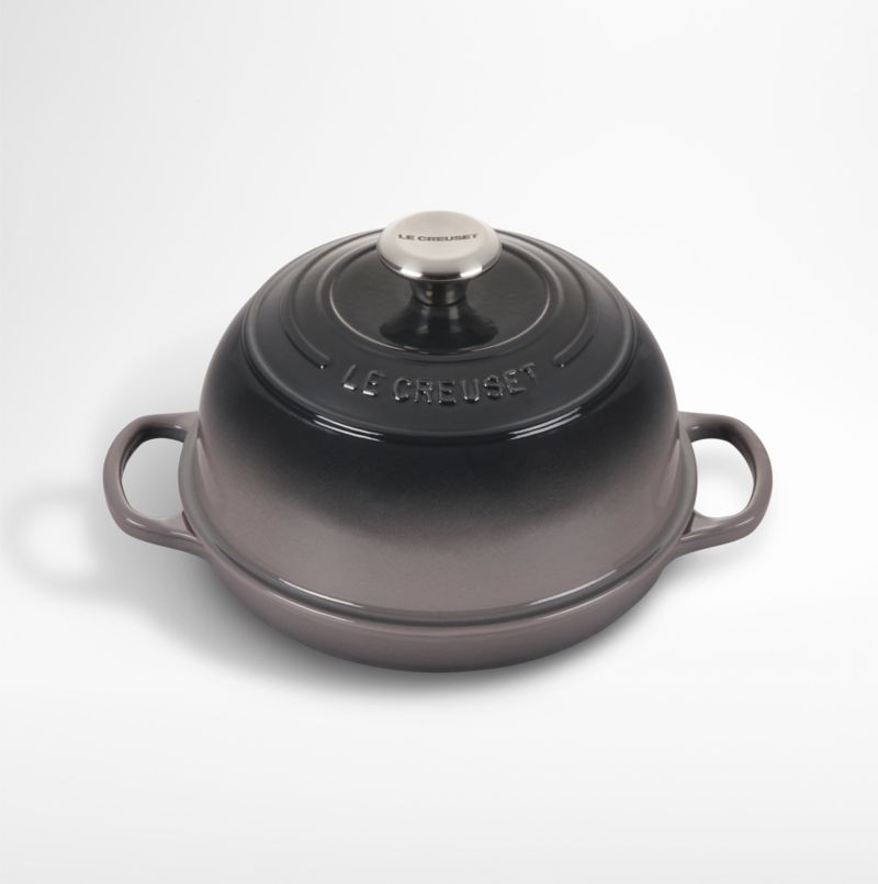 Create toothsome loaves of artisanal bread in this clever pan that transforms your oven into the ideal bread oven. Ridges on the base ensure even browning, while the tight-fitting lid traps and circulates steam to ensure maximum rise and a crisp crust. Crafted of cast iron that distributes and retains heat exceptionally well, the domed bread oven is coated in durable porcelain enamel in a creamy grey-brown inspired by oysters. Matte black satin enamel on the inside is virtually non-stick and easy-to-clean. Use the ergonomic handles and stainless steel knob—all designed to work with bulky oven mitts—to carry the bread oven to the table and present your creations with a well-deserved flourish.
