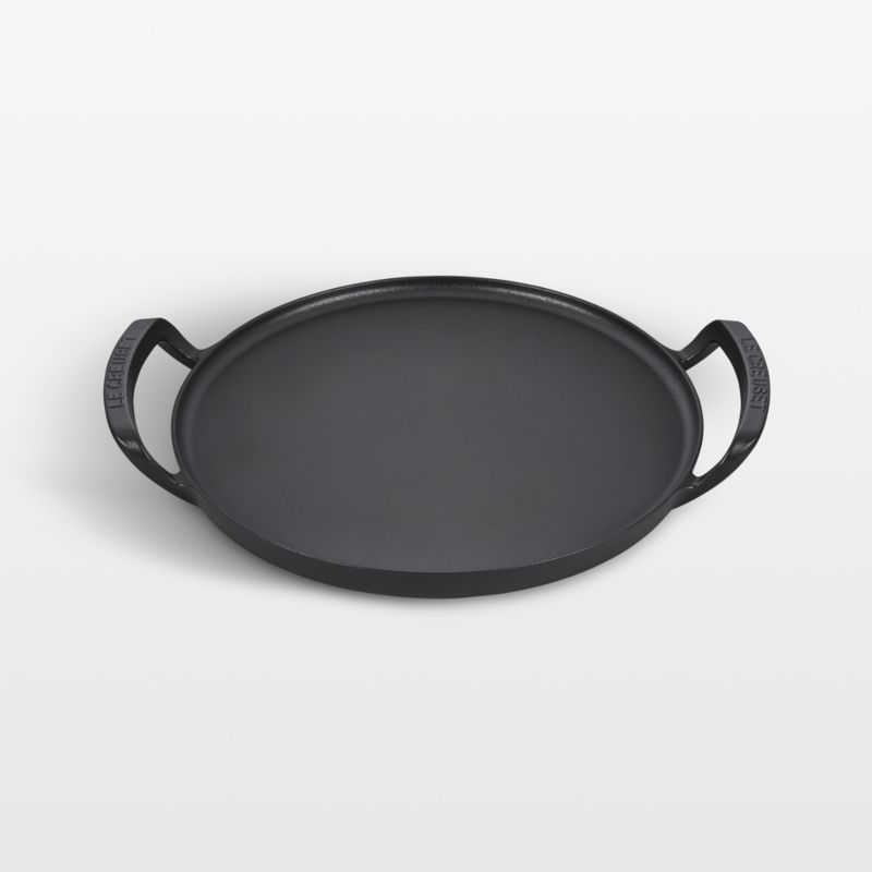 Le Creuset's beloved cast iron cookware takes to the great outdoors in the Alpine collection. Specially designed for cooking over open fires, this pizza pan also stands up to high heat in ovens, under broilers and on gas, electric and glass stovetops. The classic cast iron construction retains and distributes heat impeccably, and the matte black enamel resists chips, cracks and scratches. Over time the rugged finish develops a patina that enhances cooking performance. Raised loop handles make it easy to lift the pizza pan off the fire or grill while still fitting easily under hoods and lids. Once your alfresco pizza party is complete, the pan cleans up easily in the dishwasher. The Alpine collection makes a must-have gift for campfire cooking enthusiasts.