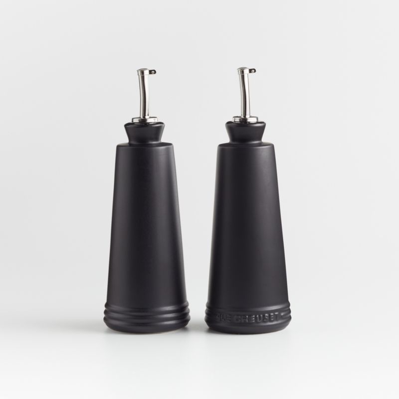 Store and pour your favorite oil and vinegar with this classic ceramic cruet set from Le Creuset. Glazed black inside and out, the stoneware bottles protect the contents from light and are capped with stainless pouring spouts with hinged caps. Use the pair on the table or next to the stove to dispense olive oil and balsamic vinegar, sesame oil and rice vinegar or walnut oil and red wine vinegar for cooking, dressing salads and finishing dishes.