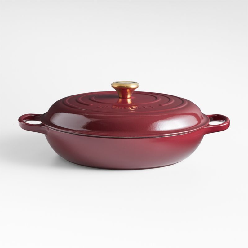 A luxurious new hue inspired by the lush region of the Côtes du Rhône in southern France. Enamel in rich wine red coats this everyday pan with a smooth, shock-resistant finish, making it impervious to acid, alkali, odors and stains. Crafted with a specially designed "all-round" lip for drip-free pouring with either hand, the pan is topped with a close-fitting lid that creates a blanket of heat for even cooking and superb braising. The lidded braiser is compatible with all types of heat sources, from gas and induction stoves to outdoor grills. Topped with a gleaming gold-finished knob, this display-worthy pan is perfect for roast chicken, paella or shakshuka.