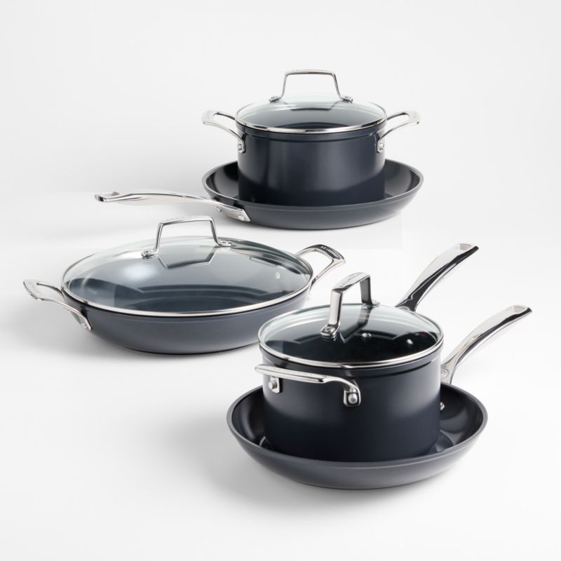Cookware legend Le Creuset introduces essential aluminum cookware that delivers superior performance. Constructed with stainless steel bases and reinforced rims to prevent warping, this heavy-gauge cookware set distributes and retains heat evenly. The advanced ceramic non-stick coating browns without oil or butter, releases food easily, resists scratching, cleans up quickly and is safe for use with metal utensils. The pans boast glass lids and ergonomic stainless steel handles that stay cool for comfortable cooking.