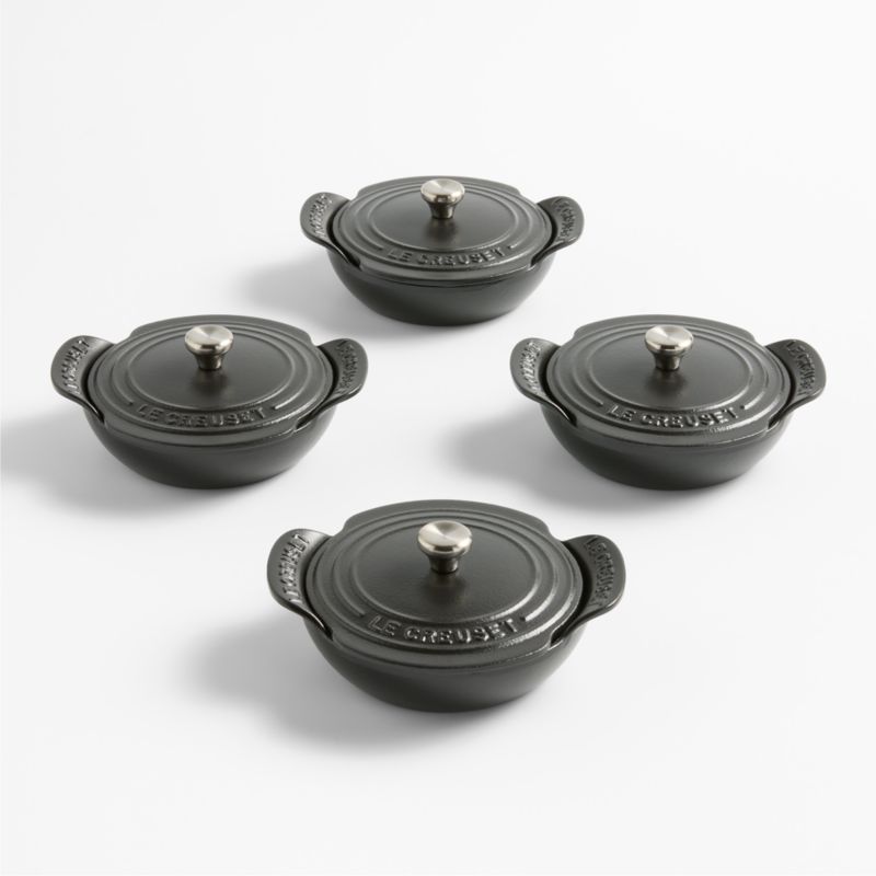 Part of Le Creuset's new single-serve Gourmand cookware collection, these mini braisers make a charming presentation of sauteed vegetables, stir-fried shrimp and braised short ribs. Durable cast iron retains and distributes heat optimally—keeping food warm throughout the meal—while the matte black enamel coating renders the pans impervious to stains, chips and cracks. The interiors curve gently for ease of eating, while the upward-arching handles make it easy to go from stove to oven to table. Topped with stainless steel knobs on their tight-fitting lids, this set of four braisers is as fantastic for entertaining as it is for weeknight family dinners.