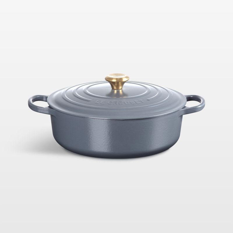 Graphite grey enamel made just for us coats a cast iron oven that is indispensable for slow-cooking, braising and roasting. The pan's wide, shallow shape browns and sears to perfection, while the large surface area helps reduce sauces quickly. Cast iron maintains even and consistent heat, and the smooth enamel promotes caramelization, resists stains and prevents sticking for easy cleanup. Topped with a gleaming gold-finished knob, the display-worthy grey Dutch oven goes from stove to oven to table for casual family meals and elegant dinner parties.