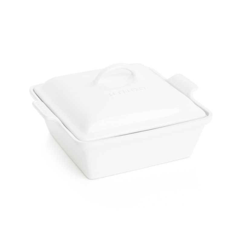 Revered by both professional chefs and home cooks since its 1925 debut, Le Creuset's classic French cookware is prized for its utilitarian good looks and unsurpassed heat retention. As beautiful as it is function, this line of stoneware bakeware features superior performance in the oven or microwave and is ideal for baked goods and roasted dishes. Crafted of dense, enamel-glazed stoneware, it blocks moisture absorption to prevent cracking and crazing and has a brightly colored exterior that resists scratches and stains. The nearly non-stick interior resists sticking, effortlessly releases foods and cleans up easily. In a clean shade of white, the covered square casserole dish is ideal for quick breads, meatloaf and more, bringing attractive color and Le Creuset style to the kitchen and table.