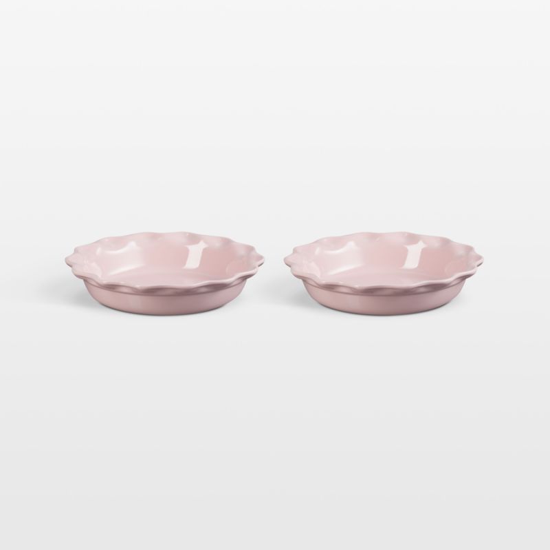 Enamel in a dreamy, sophisticated shade of ballet-inspired pink glazes these pie pans for an eye-catching presentation of home-baked pies and quiches. Based on vintage designs from Le Creuset's early days, the pie dishes feature traditional styling with scalloped rims. The two pans are made of premium stoneware to distribute heat evenly for golden-brown flaky crusts and perfectly baked fillings. Angled side walls make it easy to serve neat sweet and savory slices from these scratch-resistant, virtually non-stick pie dishes.