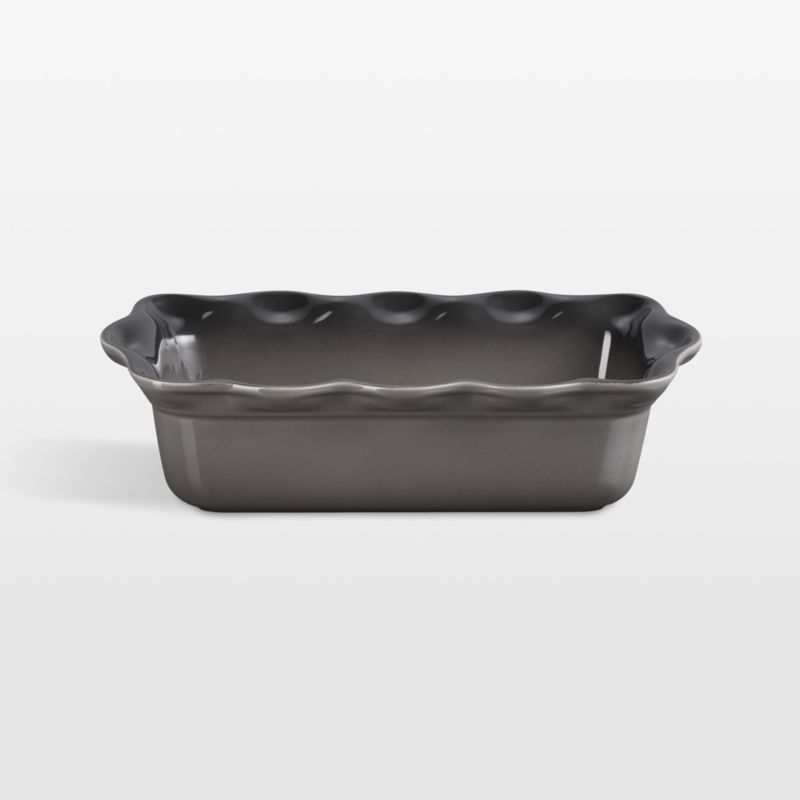 Porcelain glaze in ombre grey inspired by oysters coats this loaf pan for an elegant look. Based on vintage designs from Le Creuset's early days, the baker features traditional styling with an extravagantly fluted border for an eye-catching presentation. (The ruffles also serve as handles for easy lifting into and out of the oven.) The premium stoneware distributes heat evenly for perfectly baked cakes, quickbreads and casserole-for-two, and the glossy glaze makes the display-worthy loaf pan scratch-resistant and virtually non-stick.