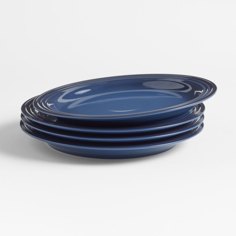 Known for its chef-inspired enamel cookware, Le Creuset introduces a premium stoneware dinnerware collection. The wide-rimmed dinner plates in this four-piece set are crafted with the same creamy glaze, graduated color and concentric-ridge detailing found in the celebrated cookware. Non-reactive and chip-, scratch- and stain-resistant, the inky blue plates make everyday meals a special occasion.