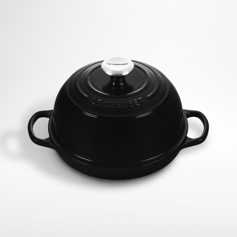 Create toothsome loaves of artisanal bread in this clever pan that transforms your oven into the ideal bread oven. Ridges on the base ensure even browning, while the tight-fitting lid traps and circulates steam to ensure maximum rise and a crisp crust. Crafted of cast iron that distributes and retains heat exceptionally well, the domed bread oven is coated in durable licorice-black porcelain enamel on its exterior and easy-to-clean matte black satin enamel on the inside. Use the ergonomic handles and stainless steel knob—all designed to work with bulky oven mitts—to carry the bread oven to the table and present your creations with a well-deserved flourish.