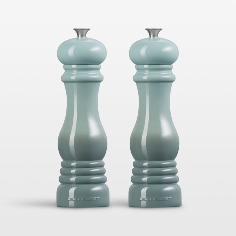 The perfect companion to Le Creuset's Sea Salt cookware, this salt and pepper set is crafted with the same concentric-ridge detailing and iconic style. Crafted of durable acrylic that won't absorb odors, the mills contain strong ceramic grinding mechanisms that crack peppercorns and rock salt with ease. This set pairs glossy blue-grey-green salt and pepper mills that look fresh and modern next to the stove or on the table.