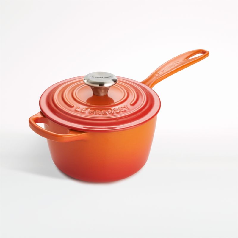 Revered by both professional chefs and home cooks since its 1925 debut, Le Creuset's classic French cookware is prized for its utilitarian good looks, unsurpassed heat retention, and lids that create an even "blanket" of heat. Cast iron saucepan with long handle and lid is clad in smooth enamel (here in a fiery flame hue), rendering each piece impervious to acid, alkali, odors and stains. Non-reactive cooking surface does not require seasoning. Compatible with all types of heat sources, from gas and electric stoves, to ceramic and glass cooktops, to induction and halogen—even solid fuel and open fire. This Signature line features larger, easier to grip handles and a stainless steel knob.