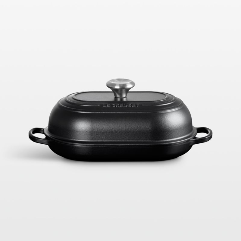 Create bakery-quality loaves with Le Creuset's bread oven featuring an elongated shape to accommodate longer loaves. Ridges on the base ensure even browning, while the tight-fitting lid traps and circulates steam to ensure maximum rise and a crisp crust. Crafted of cast iron that distributes and retains heat exceptionally well, the bread oven is coated in durable porcelain enamel in licorice-inspired matte black. Matte black satin enamel on the inside is virtually non-stick and easy-to-clean.