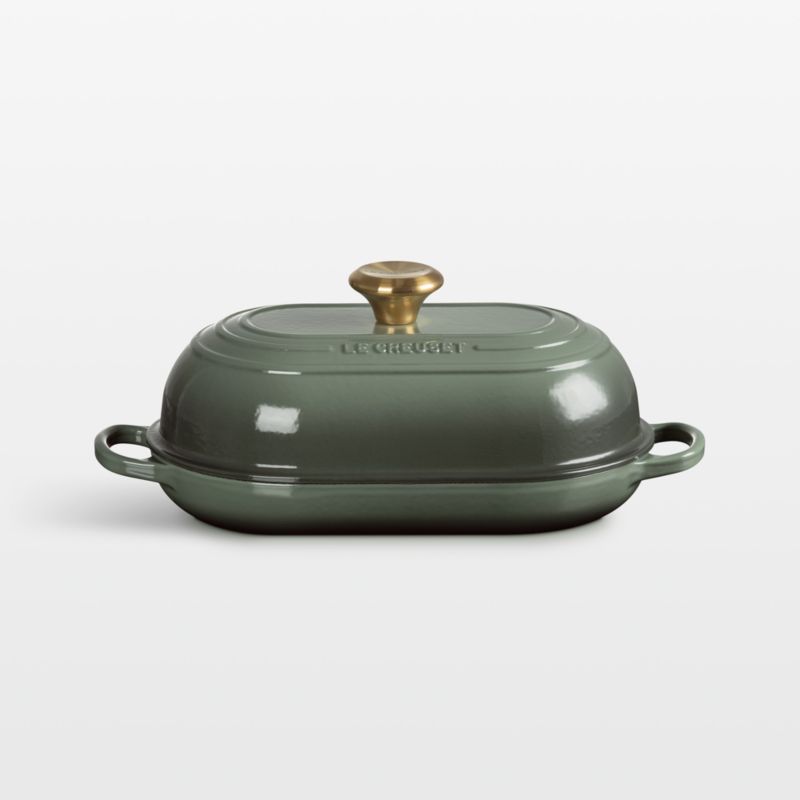 Create bakery-quality loaves with Le Creuset's bread oven featuring an elongated shape to accommodate longer loaves. Ridges on the base ensure even browning, while the tight-fitting lid traps and circulates steam to ensure maximum rise and a crisp crust. Crafted of cast iron that distributes and retains heat exceptionally well, the bread oven is coated in durable porcelain enamel in an earthy thyme-inspired grey-green—a Crate & Barrel exclusive. Matte black satin enamel on the inside is virtually non-stick and easy-to-clean.