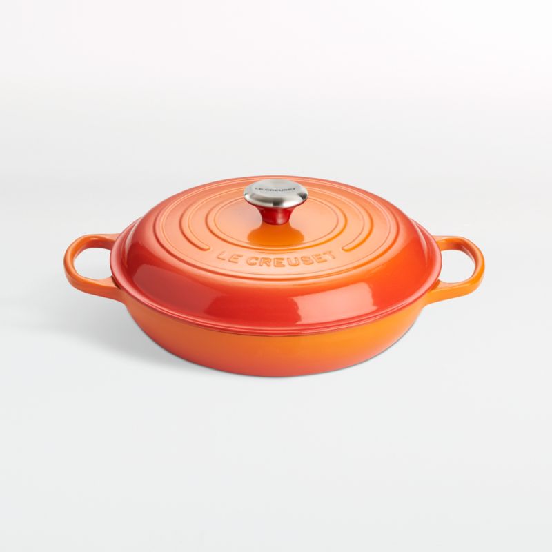 Revered by both professional chefs and home cooks since its 1925 debut, Le Creuset's classic French cookware is prized for its utilitarian good looks and unsurpassed heat retention. In a fiery flame hue, this cast iron pan is clad in smooth enamel, rendering each piece impervious to acid, alkali, odors and stains. Designed with double handles for beautiful balance, the braiser pan lends itself to a variety of cooking methods for a wide range of meals. The close-fitting lid creates a blanket of heat for even cooking, lending itself to braising and keeping foods warm. The rim of each pan has a specially designed "all-round" lip for drip-free pouring with the right or left hand. Non-reactive cooking surface does not require seasoning. This braiser pan is perfect for family-size stews, paella or rice. Compatible with all types of heat sources, from gas and electric stoves, to ceramic and glass cooktops, to induction and halogen, the pan is topped with a stainless steel knob.