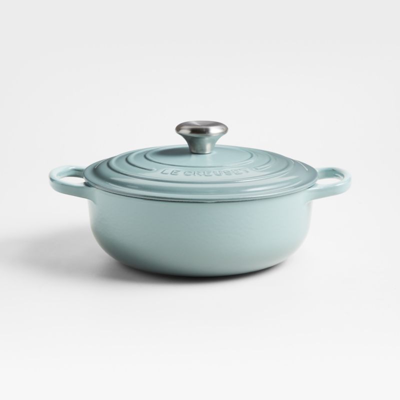 Perfectly proportioned for preparing one-pot meals, this wide-bottomed cast iron sauteuse oven braises chicken thighs, simmers sauces and bakes loaves of bread. Clad in a serene green-grey inspired by sea salt, the enameled pan boasts a non-reactive interior that resists stains, prevents sticking and encourages caramelization. Strong handles provide a sturdy grip as you transfer the lidded sauteuse from stovetop to oven to table for a timeless presentation of sides, stews or entrees.