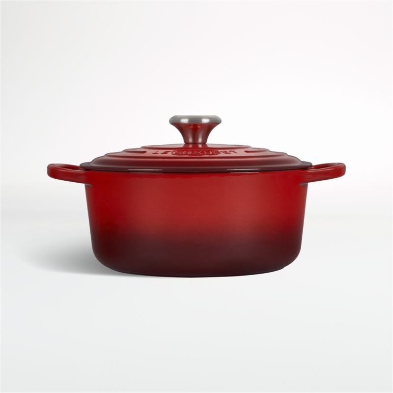 Enameled in vibrant cherry red, this cast iron Dutch oven impresses in the kitchen and on the dining table. Indispensable for slow-cooking, braising, searing, roasting or baking, the cast iron lidded pot is ideal for delivering even and consistent heat. The smooth interior promotes caramelization, resists stains and prevents sticking for easy cleanup. Sized to cook up four to five servings, the Dutch oven is ideal for family dinners or potlucks. Use it for whatever's on the menu, be it sourdough bread, soup, roast chicken or stir-fry.