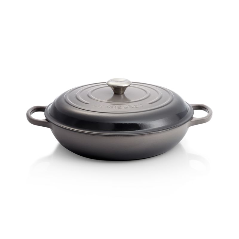 Le Creuset's cast-iron braiser pan is clad in pearlescent grey-brown enamel, rendering each piece impervious to acid, alkali, odors and stains. Designed with double handles for beautiful balance, the everyday pan lends itself to paella, casseroles and a wide range of family-sized meals. The close-fitting lid creates a blanket of heat for even cooking, lending itself to braising and keeping foods warm. The rim of each pan has a specially designed "all-round" lip for drip-free pouring with the right or left hand, and its non-reactive cooking surface braises to perfection with wet or dry cooking methods.