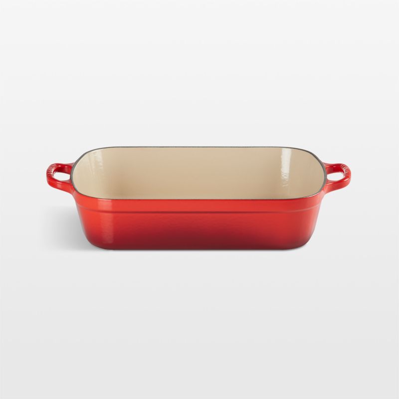 Enamel in cherry-inspired ombre red coats this gorgeous cast iron roaster. Requiring no seasoning, the durable finish resists dulling, staining, chipping and cracking. This roasting pan goes effortlessly from stove to oven to table to serve five to six servings of pot roast, casserole or strawberry crisp.