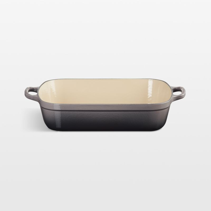 Enamel in creamy oyster-inspired grey coats this gorgeous cast iron roaster. Requiring no seasoning, the durable finish resists dulling, staining, chipping and cracking. This roasting pan goes effortlessly from stove to oven to table to serve five to six servings of pot roast, casserole or strawberry crisp.