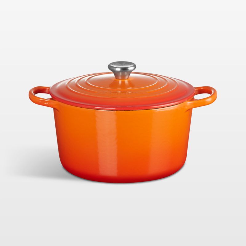 Le Creuset's trademark ombre red-orange enamel finish in fiery shades of molten iron coats the exterior of this deep Dutch oven, while the smooth interior promotes caramelization and is impervious to acid, alkali, odors and stains. Topped with a stainless steel knob, the close-fitting lid creates a blanket of heat for moist and even cooking. The oven's depth makes it particularly perfect for stewing, braising, slow-cooking and deep frying.