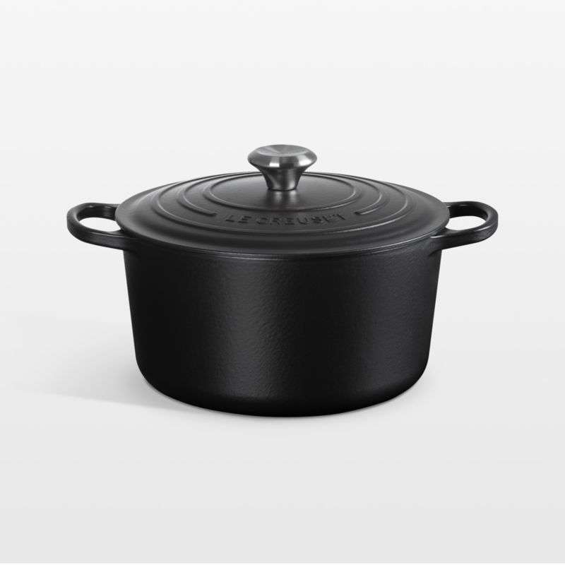 Crafted of Le Creuset's renowned heat-retaining, high-performing cast iron, this deep Dutch oven is coated with a durable enamel glaze in licorice-inspired black. The generously sized pot is perfect for soups and stews, and because of its depth is less prone to boil-overs or splatters. A smooth interior promotes caramelization and is impervious to acid, alkali, odors and stains. The close-fitting lid creates a blanket of heat for moist and even cooking.