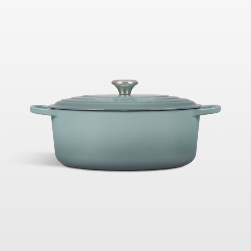 Enameled in an oceanic blend of grey, green and blue inspired by sea salt, our exclusive cast iron oven is indispensable for slow-cooking, braising, searing, roasting or baking. The lidded pot maintains even and consistent heat and has a smooth interior that promotes caramelization, resists stains and prevents sticking for easy cleanup. Ideally shaped for a whole chicken or a large roast, the display-worthy Dutch oven cooks five to six servings for casual weeknight meals and elegant dinners.