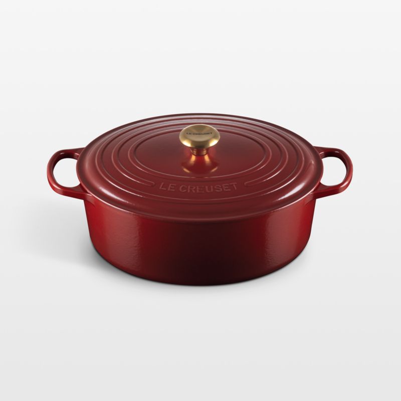 A luxurious new hue inspired by the lush wine-making region of the Côtes du Rhône in southern France. Enamel in rich wine red coats the exterior of this oval Dutch oven, while the smooth interior promotes caramelization and is impervious to acid, alkali, odors and stains. Topped with a gleaming gold-finished knob, the close-fitting lid creates a blanket of heat for moist and even cooking. The oval shape and generous capacity are ideal for cooking larger cuts of meat and whole chickens or for baking oval-shaped loaves of bread.