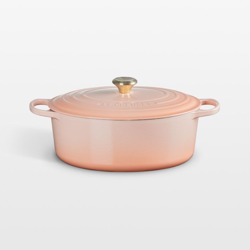 Inspired by perfectly ripe peaches and effervescent bellinis, the rosy Peche enamel that coats this oval Dutch oven glows with a hint of gloss. The smooth interior promotes caramelization and is impervious to acid, alkali, odors and stains. Topped with a gleaming gold-finished knob, the close-fitting lid creates a blanket of heat for moist and even cooking. The oval shape and generous capacity are ideal for cooking larger cuts of meat and whole chickens or for baking oval-shaped loaves of bread.
