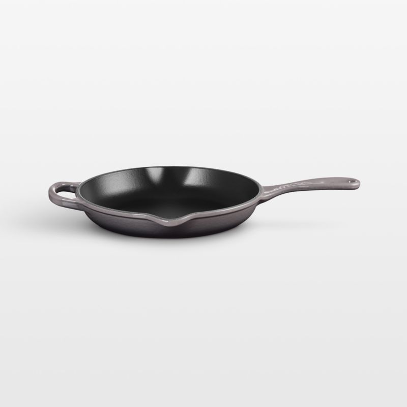 Porcelain enamel in warm, creamy grey inspired by oysters coats this cast iron skillet with a smooth finish that resists cracking, dulling and staining. Formulated to work with higher temperatures, the black non-reactive cooking surface does not require seasoning, naturally developing a nearly non-stick patina. Use this frying pan to brown Brussels sprouts, fry eggs and bake personal pan pizzas.