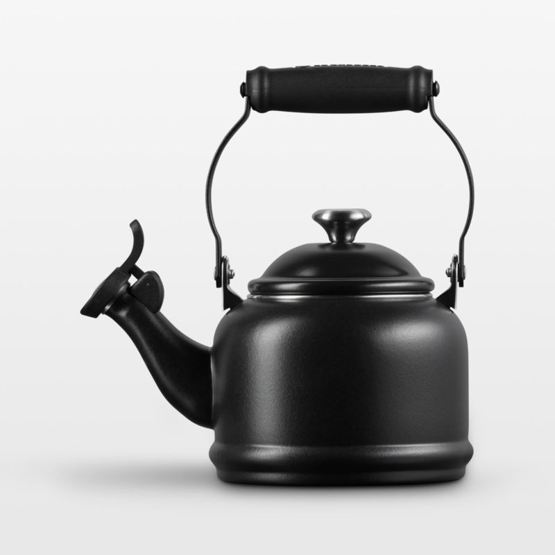 Black porcelain enamel inspired by licorice coats this display-worthy tea kettle for a classic look.The warm and nuanced porcelain enamel glazes a base of lightweight, fast-heating and responsive carbon steel. Creuset's demi-sized kettle suits smaller kitchens, just the right size for making pour-over coffee or tea for two. Made of quick-heating carbon steel that works with all cooktops, the kettle has a stay-cool handle and pleasant whistle.