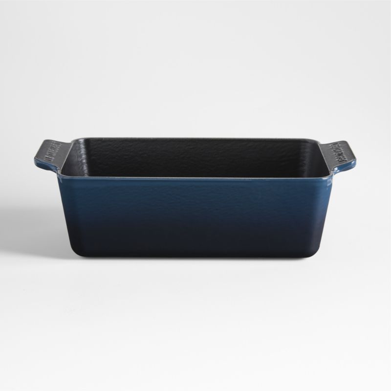 Crafted of durable cast iron, this loaf pan bakes cakes, quick breads, lasagna and more. The exclusive inky blue porcelain enamel coating—named after the French word for night—coats the exterior of the straight-sided baker with a subtle ombre shading. Inside, the black satin interior will develop a nearly non-stick patina. Going from stovetop to oven to table, this classic loaf pan serves sweet or savory baked goods in style then cleans up easily in the dishwasher.