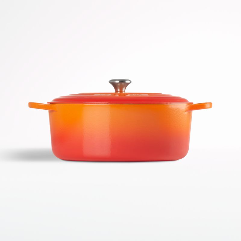 Le Creuset's signature flame color takes its inspiration from the raw beauty of molten iron being poured from a crucible, or "creuset" in French. Made of enameled cast iron, this large Dutch oven is perfect for roasting, braising and slow cooking. The oval shape is particularly suited to cooking longer cuts of meat or poultry. Impervious to acid, alkali, odors and stains, the Dutch oven provides unsurpassed heat retention, with a lid that creates an even "blanket" of heat. Compatible with all types of heat sources, from gas and electric stoves, to ceramic and glass cooktops, to induction and halogen, the oven has a larger, easy-to-grip handles and a stainless steel knob on the lid.