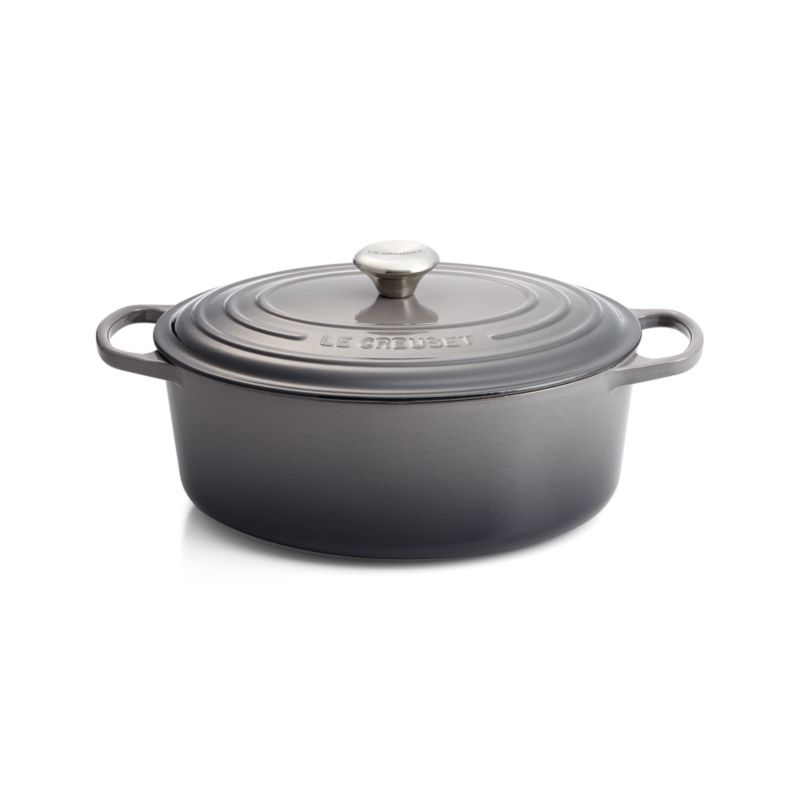 Made of cast iron enameled in pearlescent grey-brown, this Dutch oven maintains even and consistent heat for slow cooking, braising and roasting. A master at searing and browning meats before slowly cooking them to perfection, the oven has an oval shape that accommodates long cuts of meat and poultry. Compatible with all types of heat sources, from gas and electric stoves, to ceramic and glass cooktops, to induction and halogen, the oven has easy-to-grip handles and a stainless steel knob on the lid.