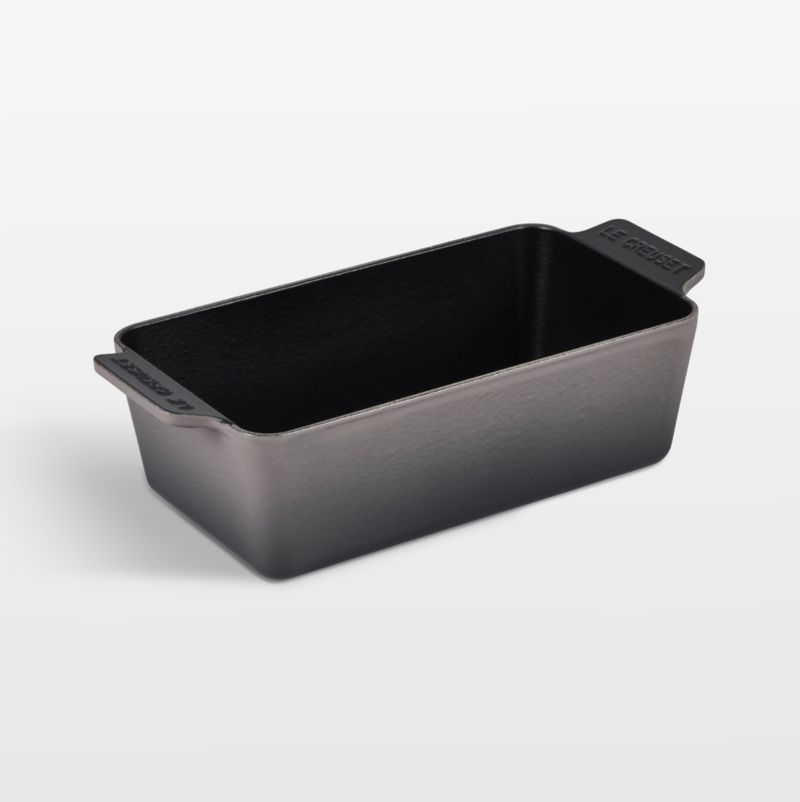 Crafted of Le Creuset's legendary cast iron, this loaf pan bakes cakes, quick breads, lasagna and more. Oyster-inspired grey enamel coats the outside of the straight-sided baker, pairing elegantly with the black satin interior that will develop a nearly non-stick patina. Going from stovetop to oven to table, this classic loaf pan serves sweet or savory baked goods then cleans up easily in the dishwasher.