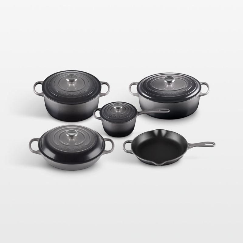An oyster-inspired finish in creamy grey-brown coats the exteriors of these heirloom-quality pots and pans. The porcelain enamel coating is not only beautiful, it also ensures that the cast iron cookware set is impervious to acid, alkali, odors and stains. Topped with stainless steel knobs, the lidded saucepan, braiser and Dutch ovens are ideal for making soups, roasts and one-pot meals. The skillet fries up sausage, hash browns and pancakes to golden-brown perfection. The non-reactive cooking surfaces do not require seasoning, and the cookware is compatible with all types of cooking surfaces. A fabulous wedding, housewarming or graduation gift, this nine-piece set goes gorgeously from oven to stove to table.