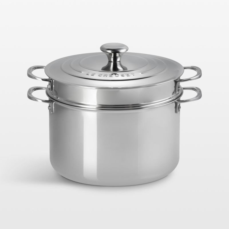 As radiant as it is durable, Le Creuset's Signature stockpot combines a performance-driven design with superior tri-ply construction. Titanium-infused stainless steel is non-reactive and resists scorching, while the base-to-rim aluminum core offers excellent heat distribution for even, efficient cooking. The deep pot features a lid with built-in steam vents, a dripless rim and a removable colander insert that's indispensable for straining pasta, vegetables and seafood.