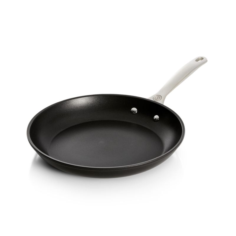 Made with a toughened construction, Le Creuset introduces hard-anodized aluminum cookware that delivers superior non-stick performance. Hot-forged to prevent warping and deliver consistent heat distribution, this frying pan has a highly engineered non-stick coating that won't chip or flake and is safe for use with metal utensils. Perfect for eggs, pancakes and stir-frys, the skillet has a shallow design and attractive cast stainless steel handle that minimizes heat transfer and fits comfortably in the hand.