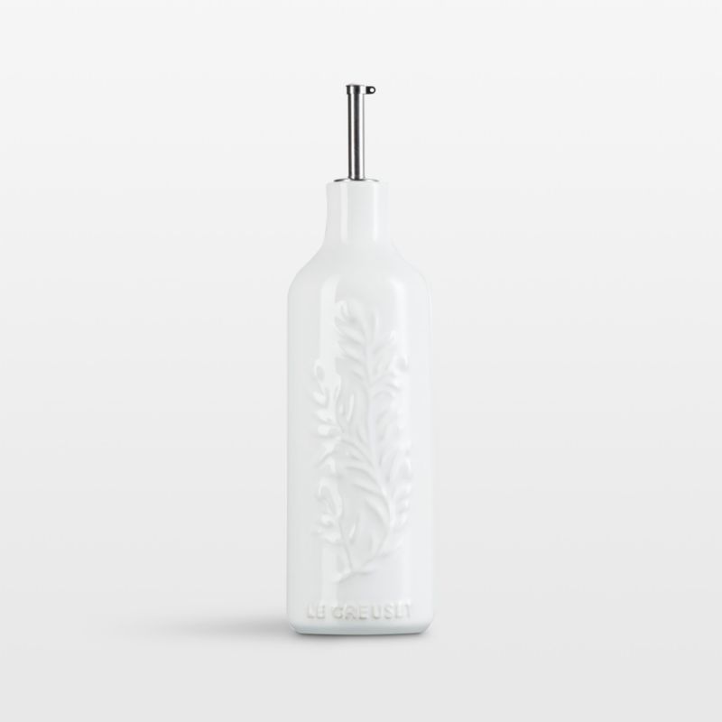 Inspired by the sun-drenched fields of Provence, a graceful olive branch textures this lovely olive oil cruet. The display-worthy ceramic vessel has a serene presence on your dining table or countertop, protecting the contents from light and heat. A nonporous porcelain glaze coats the cruet in a deep green. The stainless steel nozzle pours precisely, whether you're cooking, dressing salads or drizzling on a luxurious finishing touch.
