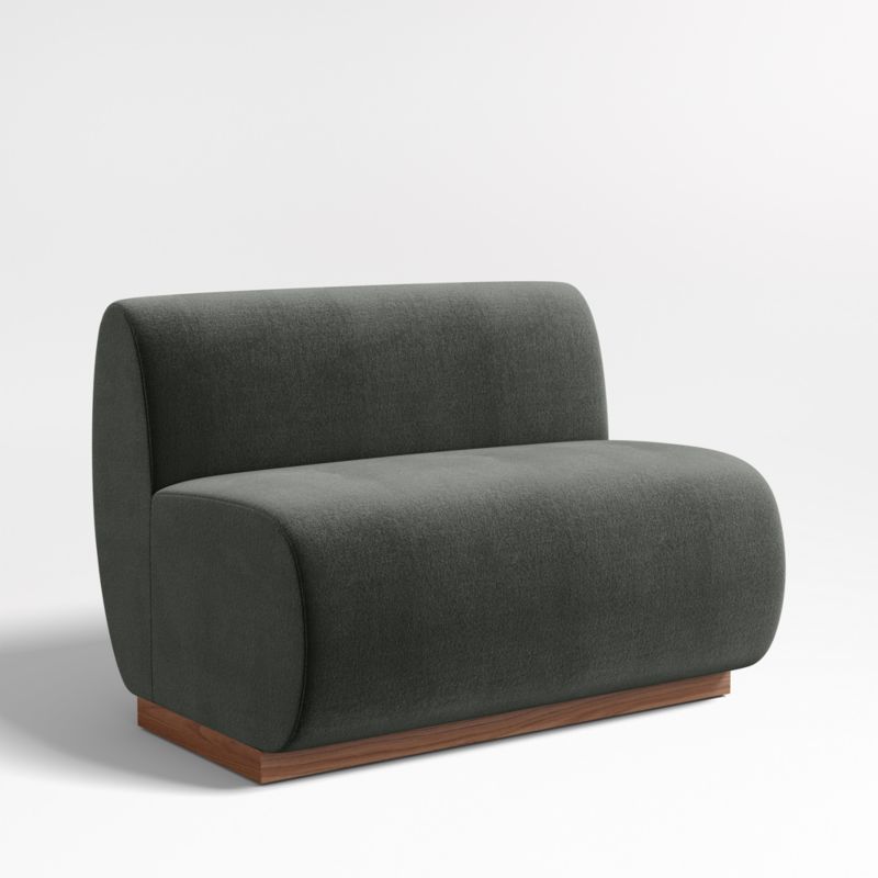 The best seat in the house. Leandro brings home the luxe feel of VIP fine dining with its soft faux-mohair upholstery in dark grey. Waterfall curves give the banquette's tight seat and back a graceful look, while oversized cushions dominate the design and anchor your dining room or kitchen with contemporary style. Supportive foam cushioning holds its shape for many dinner parties to come, wrapped in soft fiber for comfort. Combine the banquette with the Leandro corner and single banquettes for a custom arrangement to suit your space.