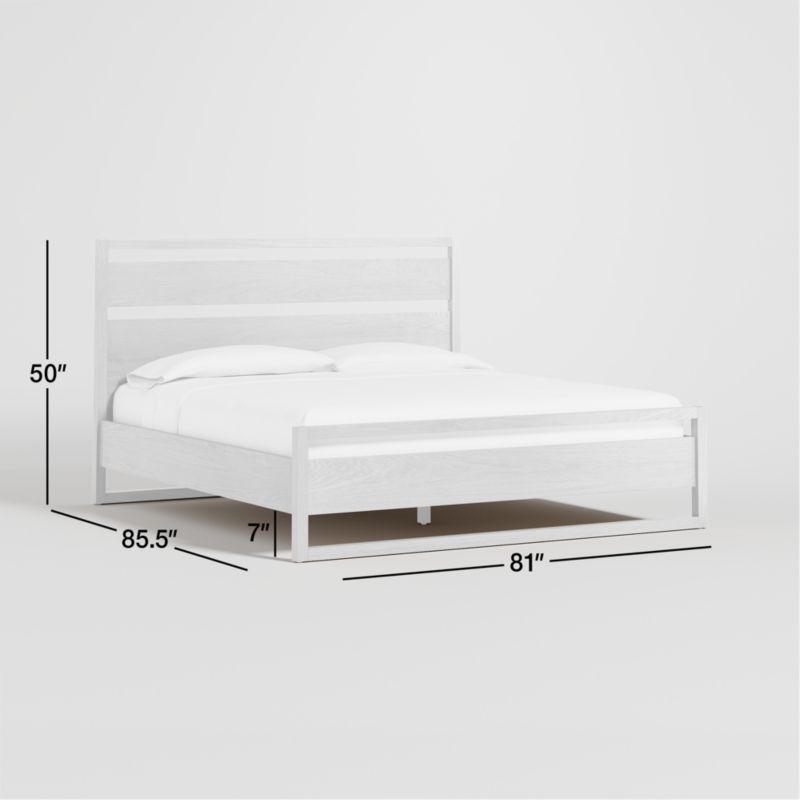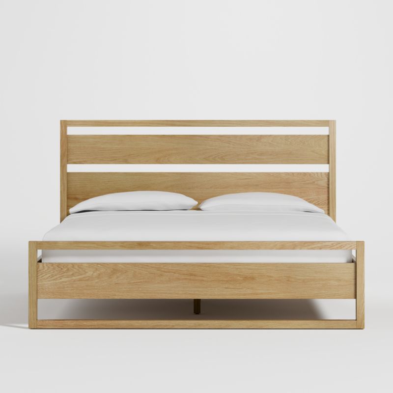 Simple geometry and pure craftsmanship set off the beauty of white oak in our Leavitt bed. Enhanced by a natural rye finish, the wood's lively grain stars in broad rails, open sleigh legs and thin and thick headboard slats. Woodworking details add artisan appeal in precisely aligned butt joinery and squares of end-grain that accent the corners. The Leavitt bed is a Crate & Barrel exclusive.