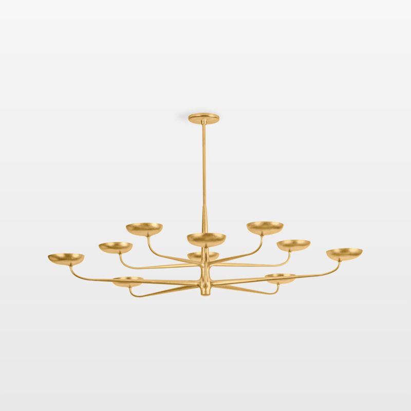 The stunning Leiria chandelier balances the glamorous with the organic. Gleaming with a vintage gold leaf finish, graceful arms arc to support 10 shallow, upturned shades that remind us of lilypads or champagne coupes. This grand chandelier has so much presence without dominating a space, making it a great choice for high-ceiling entryways as well as cozy breakfast nooks.