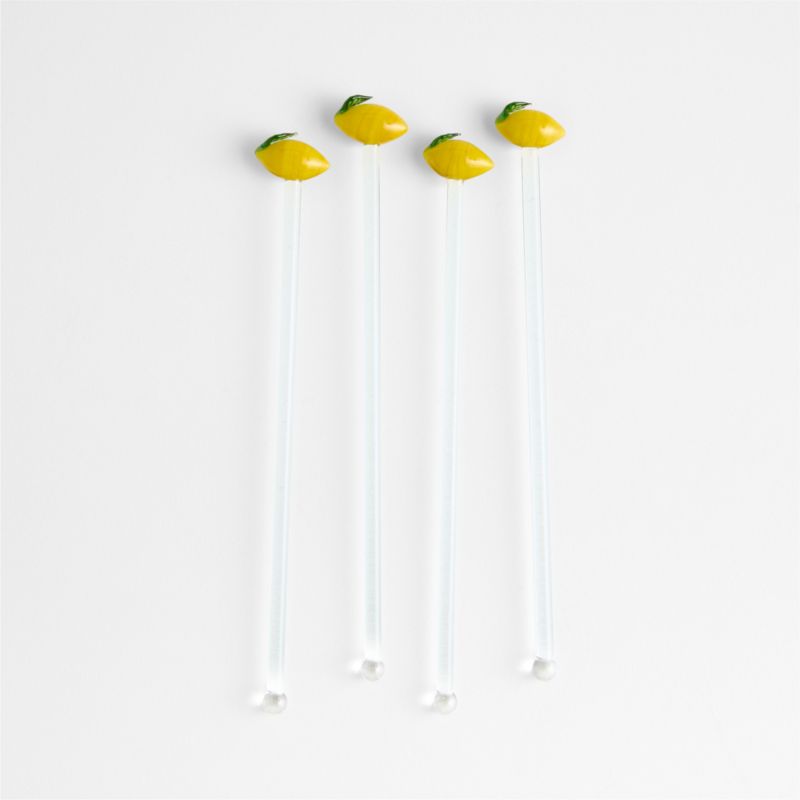 Petite lemons top our clear glass drink stirrers, lending zest to Palomas, Lemondrops and other citrus-forward pours. Made of hand-blown glass, the set includes four stirrers.
