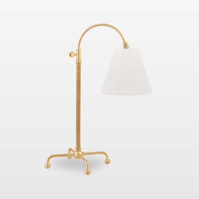 We love the graceful curves and retro charm of the Leon table lamp. Crafted of brass with an aged brass, the lamp stands four curved legs with ball feet. Its stem transitions from textured to sleek as it arcs to suspend an off-white linen taper shade. Knobs adjust the height and shade angle to focus light where it's needed.